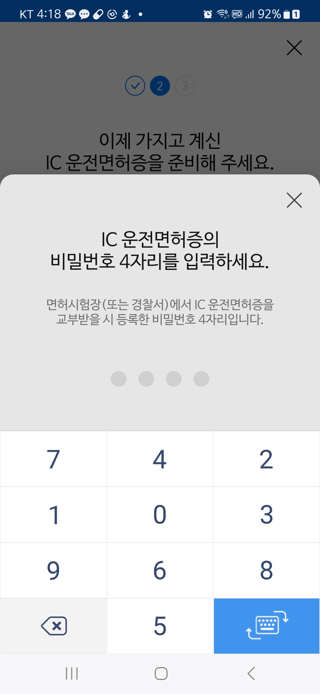 경찰서에서 IC 운전면허증 수령 시 모바일 운전면허증 발급에 필요한 비밀번호 네자리를 입력하라고 합니다.