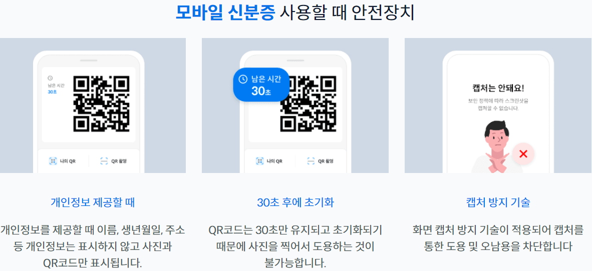 모바일 신분증은 개인 스마트폰에 안전하게 저장하여 편리하게 사용할 수 있는 시눈증으로 기존 신원증명의 패러다임을 180도 바꾸는 혁신적인 서비스입니다. 모바일 신분증은 실물 신분증과 법적으로 동일한 효력을 가지는 행정기관에서 발행하는 신분증입니다. 신분증이 필요한 곳에서 언제 어디서나 편리하게 이용하실 수 있습니다.