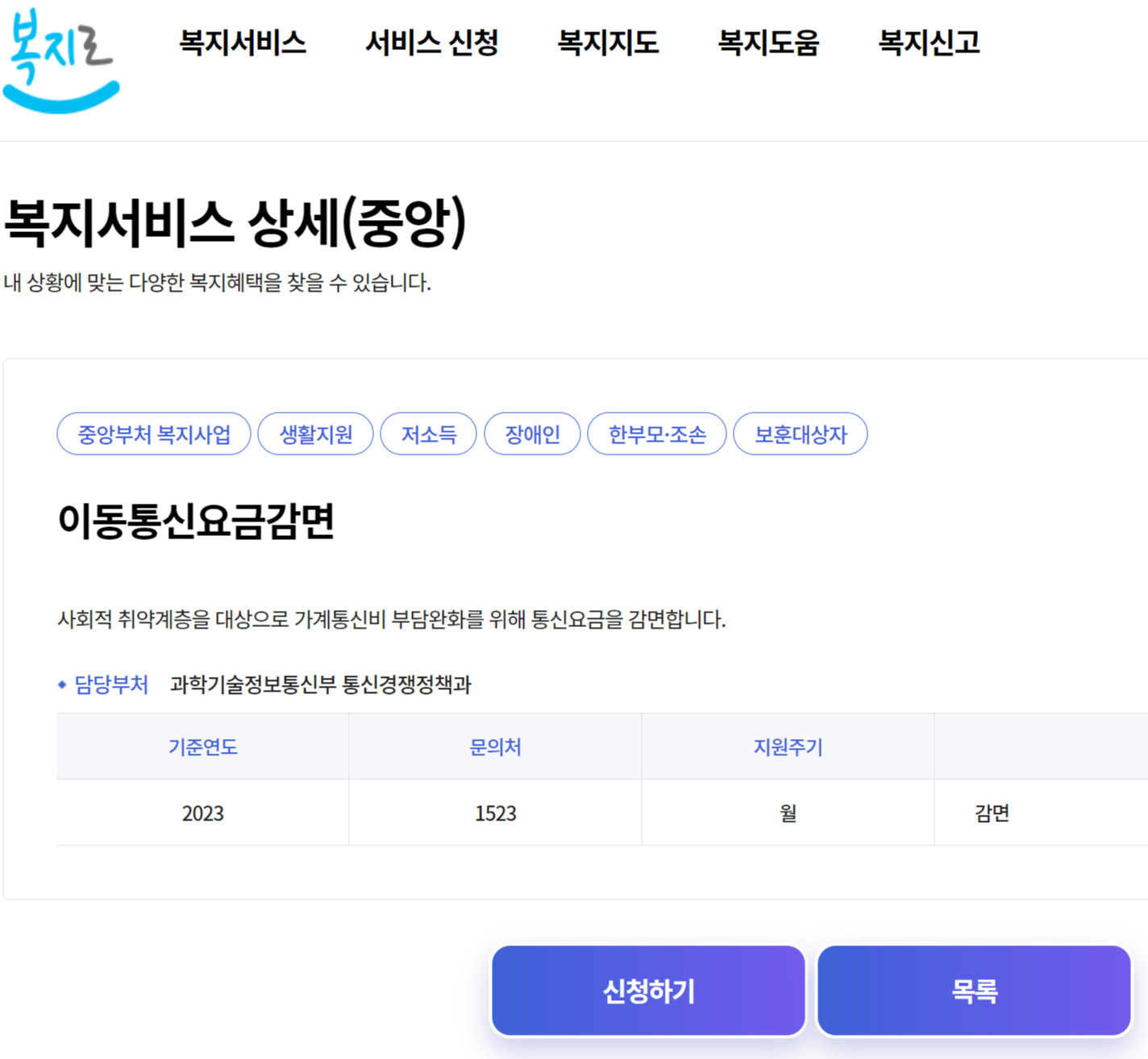 복지로 온라인신청 경로 : 복지로 로그인 > 서비스 신청 > 복지서비스 신청 > 복지급여 신청 > 기타 > 요금감면서비스