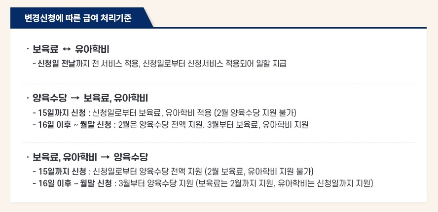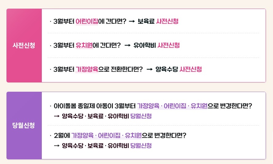 ☞ 사전신청 마감 후 3월에도 보육료(어린이집), 유아학비(유치원) 서비스 신청이 가능합니다.