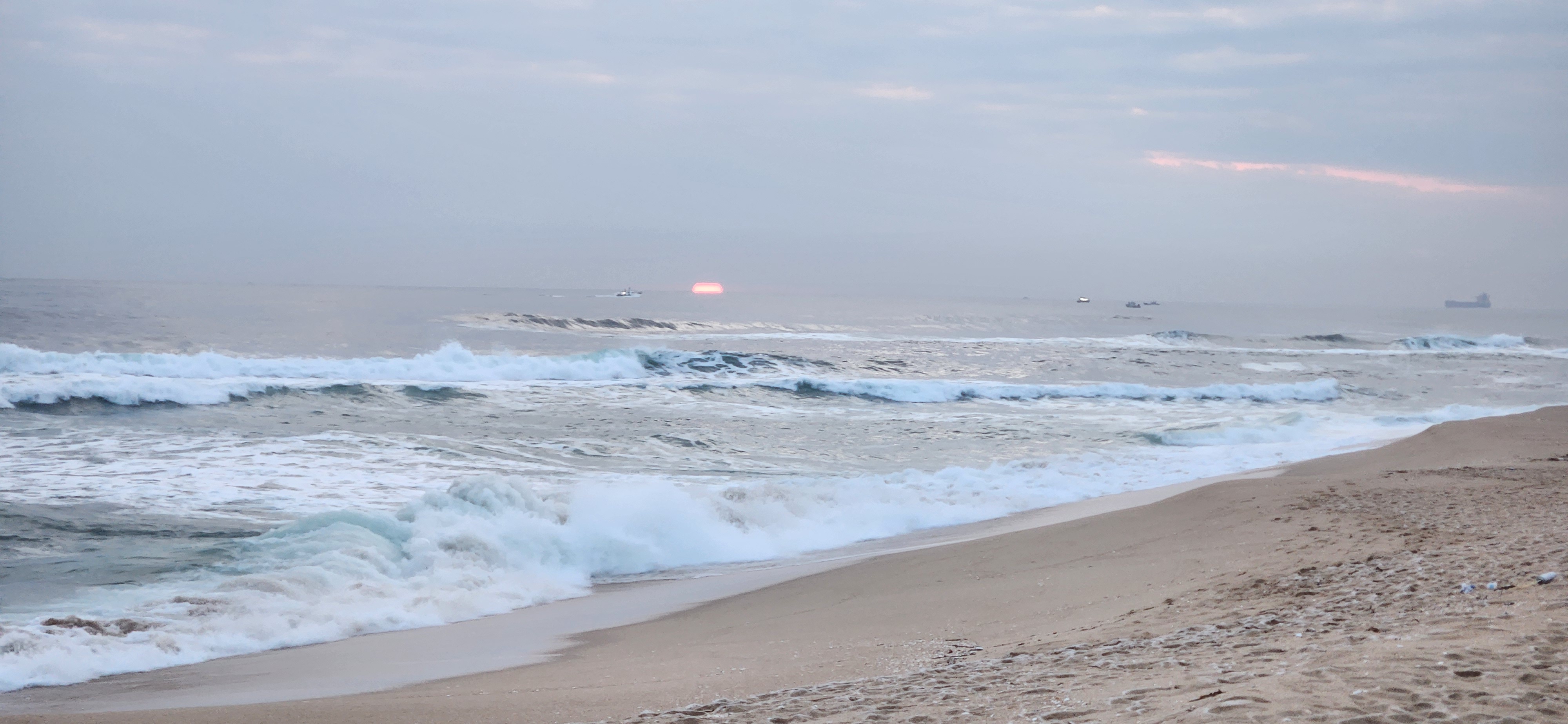 그런데 놀랍게도 6시 57분이 되니 저 멀리 수평선에서 붉은 해가 머리를 내밉니다. 놀라운 탄성을 지르며 사진을 찍습니다.