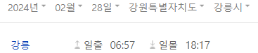 강릉 송정해수욕장에서 2024년 2월 27일~28일 1박 2일 여행차 숙박을 하였는데 숙소가 강릉 송정해수욕장 바로 앞이다보니 피곤하지만 간만에 일출을 보겠다는 일념하에 다음 날인 28일 날씨와 일출시간을 검색하였습니다.