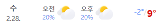 우선 2월 28일 날씨는 구름과 해가 함께 있는 것으로 나오기에 1%의 가능성을 믿고 일출을 보기로 결심하였습니다.